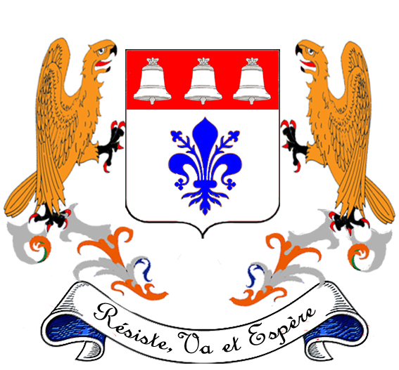 cloches d’argent. Support : deux aigles essorantes d’or, armées et