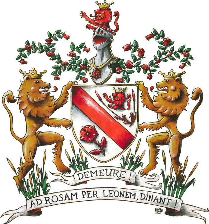 | D’argent à trois chevrons de gueules; au franc-canton d’or chargé d’un lion de sable. CFH, 2003.